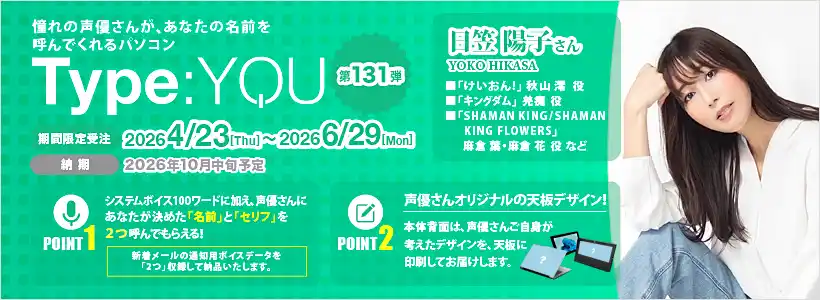 株式会社スマッシュコア エンターテインメント(本社:東京都中央区、代表取締役:福池 功)は、自社が運営する『オンリーワンPCストア【スマッシュコア】』にて、2026年4月23日(木)より、声優オリジナルパソコン【Type:YOU(タイプユー)】シリーズ第131弾となる 日笠陽子 さんモデルの受注受付を開始いたします。受注期間は2026年6月29日(月)までの期間限定となります。 |