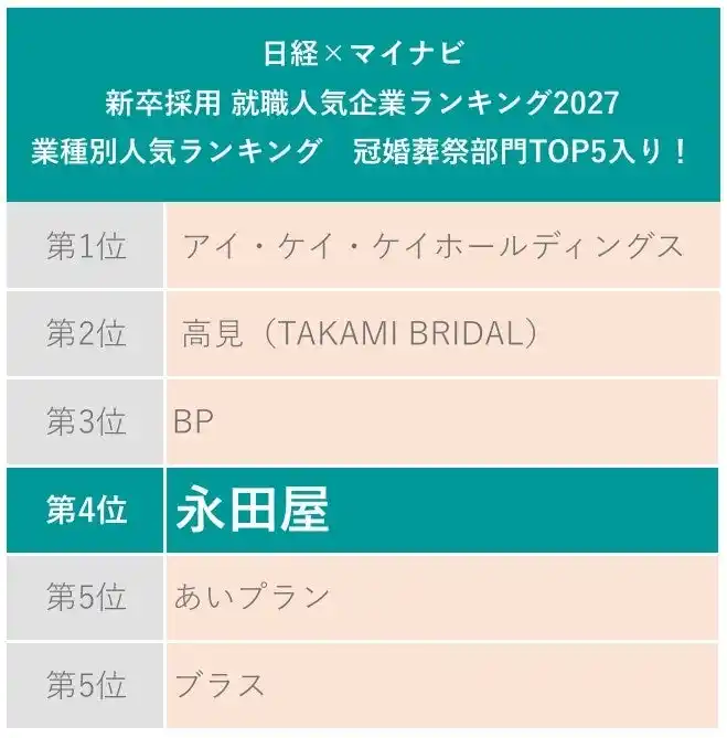 | 【創業113年の葬儀社 永田屋】2027年卒大学生就職企業人気ランキングにて「冠婚葬祭部門」第4位にランクイン! |