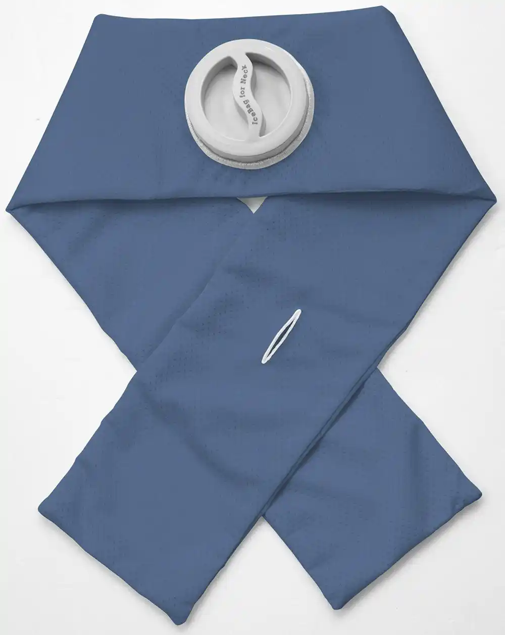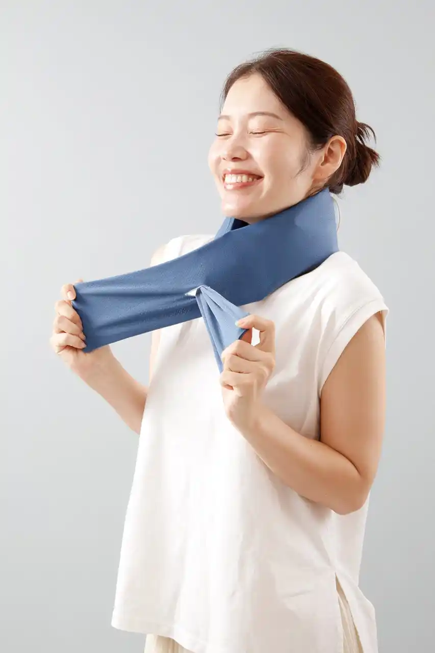 濡らすと冷たくなる生地を使用した、首などに巻きつけて使用できる氷のう。内袋を取り外すと洗濯も可能。 |