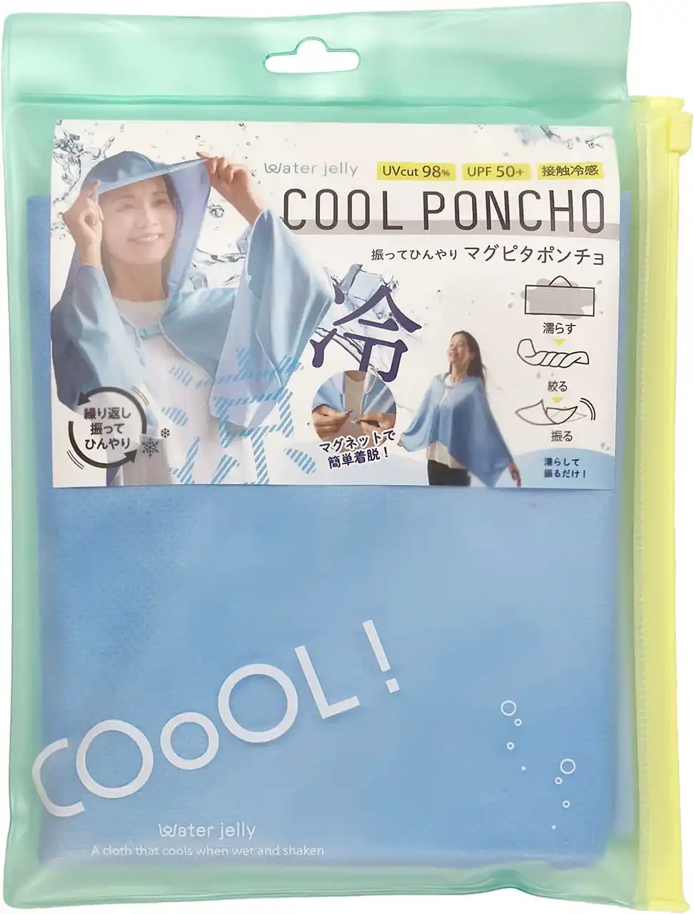 濡らして振るだけでひんやりするポンチョ。マグネットで簡単に着脱でき、 |