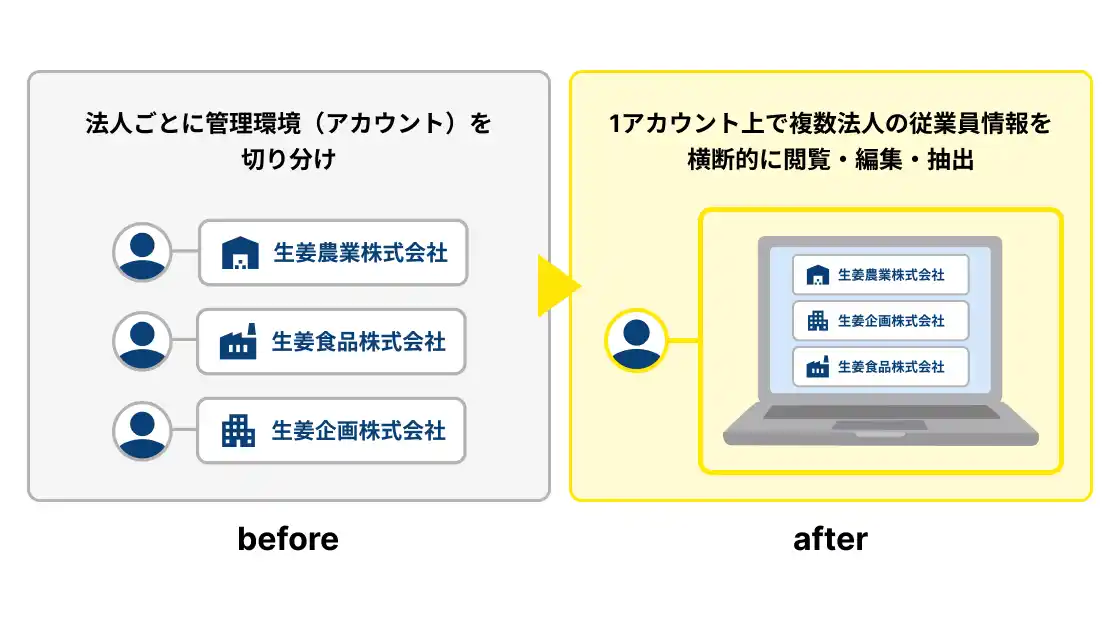 法人ごとに画面を切り替えて管理する手間を省き、1つの管理画面からグループ全社の従業員を横断的に閲覧・編集・抽出できます。 |