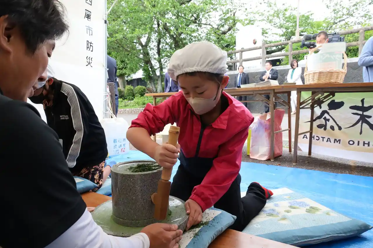 西尾市は、抹茶の原料となる「てん茶」の全国有数の産地です。矢作川の肥沃な土壌と川霧が発生しやすい気候を活かし、伝統的な「棚式覆下栽培」を行っています。その年に最初に収穫する新芽である「一番茶」の摘採前約20日間、遮光資材で覆い日光を制限することで、旨味と美しい緑色を蓄えた高品質な茶葉が育ちます。収穫した生葉は揉まずに乾燥させ、鮮度を保つためてん茶の状態で保存し、提供直前に石臼で挽き、香り高い抹茶として届けられます。 |
