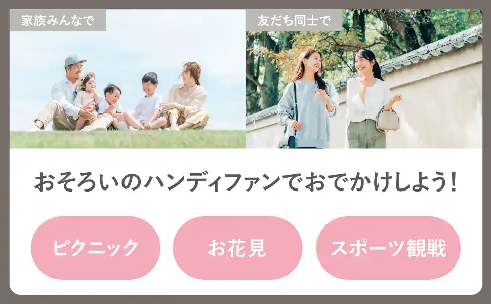| 色とりどりのおそろいのハンディファンをおともに、ご家族やご友人と春のレジャーをお楽しみください。 | |||||||||||||