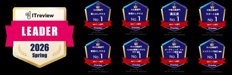 また、MAツール部門の大企業部門では2項目でNo.1を獲得(導入のしやすさ、管理のしやすさ)、中堅企業部門では2項目でNo.1を獲得(満足度、サポート品質)、中小企業部門では4項目でNo.1を獲得(管理のしやすさ、Cookie情報とのひも付け機能、ターゲティング、キャンペーン管理機能、スコアリング設定機能)しています。 |