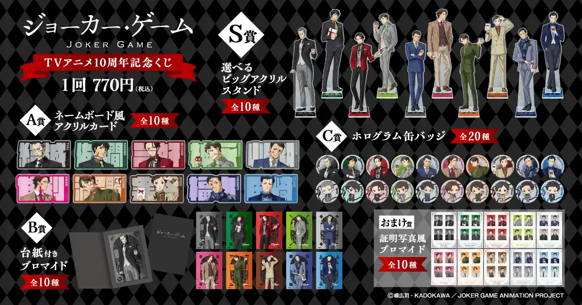 株式会社KADOKAWA(本社:東京都千代田区、取締役 代表執行役社長 CEO:夏野 剛、以下 KADOKAWA)は、運営するオンラインくじサービス「くじ引き堂」において、TVアニメ『ジョーカー・ゲーム』の豪華賞品が手に入る<ジョーカー・ゲーム TVアニメ10周年記念くじ>を、2026年5月16日(土)12時より販売します。
