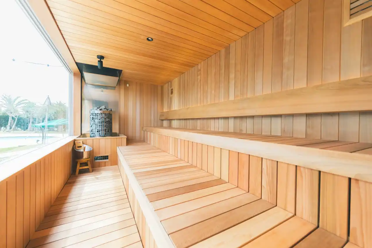 アウトドアサウナ「ラグナサウナ」も屋外プールオープン日の同日に、2026年4月29日(水・祝)より、午前の部(8:00~12:00)が新たに加わります。朝の澄んだ空気の中、レッドシダーの深みある香りに包まれながら汗をかく、清々しいリゾートの朝時間がここから始まります。室内正面はガラス張りで、サウナに入りながらガーデンとプールを一望できる開放的な設計。ロウリュをすれば香りがさらに際立ち、南国の景色とともに深い「整い」へと導いてくれます。4月29日以降は午前・午後の2部制となり、より多くの時間帯でご利用いただけるようになります。 |