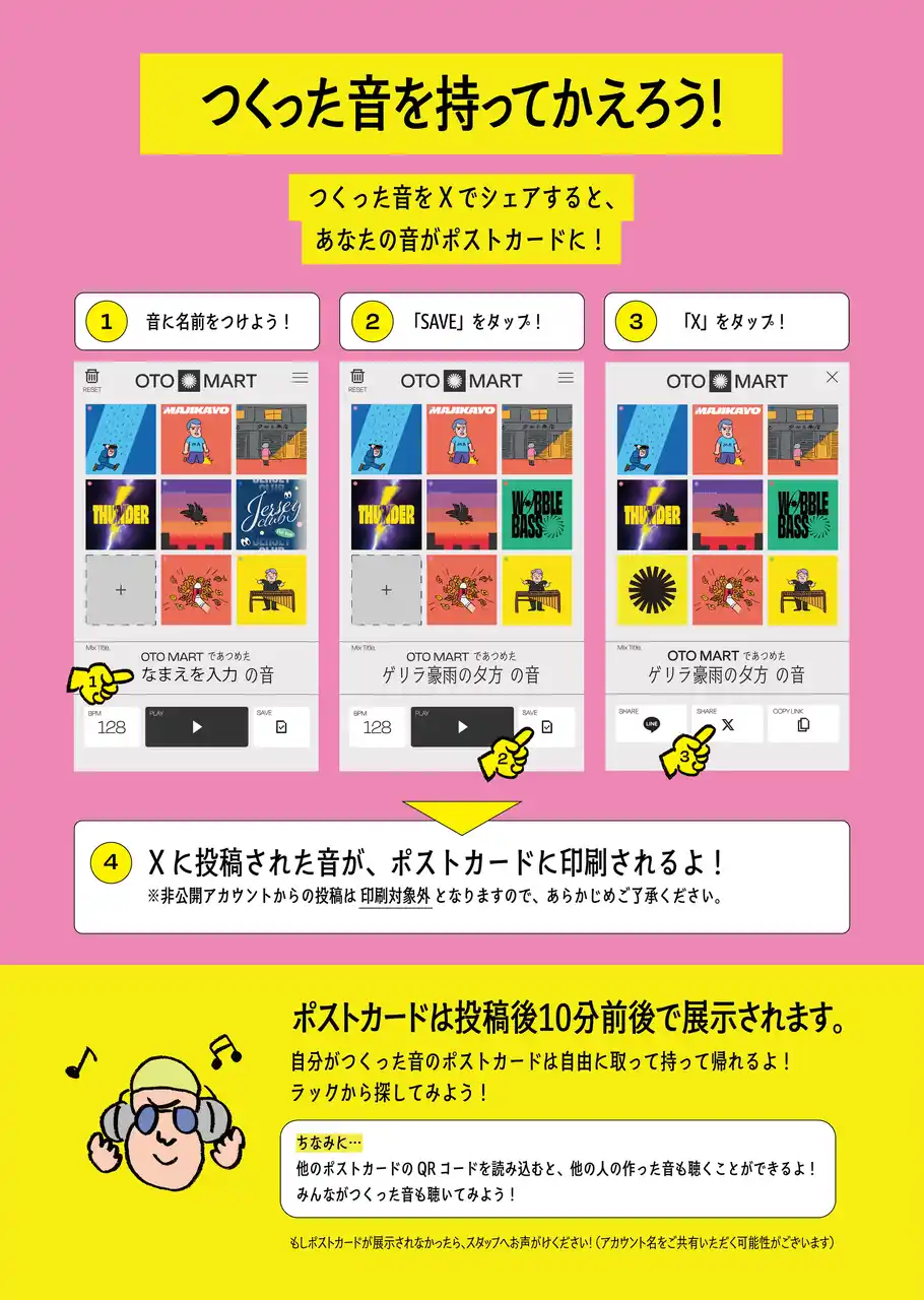 「OTO MART」でつくった音をXでシェアいただくと、10分前後でポストカードに印刷され、会場内のラックに展示されます。自分がつくった音のポストカードは自由に持ち帰ることができます。また、ラックに展示されている他のポストカードのQRコードを読み込むと、他の人が作った音も自由に聴くことができ、お気に入りの音のポストカードを見つけたら持ち帰ることも可能です。 |