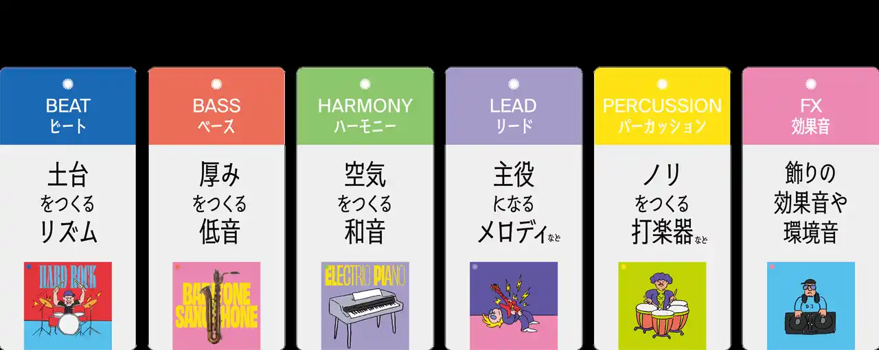会場に展示されている音は、ビート、ベース、ハーモニー、リード、パーカッション、FXの6つのパートに分類されています。この6つをバランスよく重ねることで、どなたでも簡単に作曲をお楽しみいただけます。 |