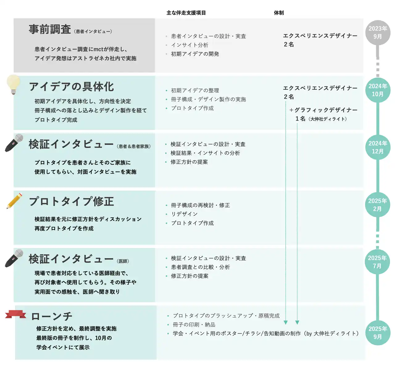 | ご担当者がアイデアの種を起点に、プロトタイピングから検証、最終化までをプロジェクトチーム一丸となって推進。アストラゼネカ側がプロジェクトの軸となる「この冊子の目的・意味やネーミング」を確立。mctのエクスペリエンスデザイナー2名がそれらを具体的な問いや構成へと落とし込み、大伸社ディライトのグラフィックデザイナーとも連携。検証インタビューでは関与者全員で患者さん・ご家族の想いを受け止め、冊子という形に仕上げた。 | |||||||||