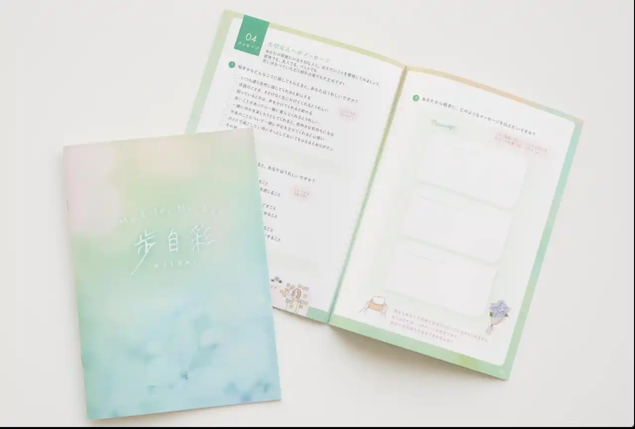 | 『歩自彩(Ajisai)』は、子宮体がんを経験された方が、問いに沿って自分の言葉を書き出していくノートスタイルのサポートツールです。全16ページで、現在・過去・未来を振り返りながら、自分の想いや価値観、これからの生き方を少しずつ整理していくことができます。書いた内容は、ご家族やパートナー等ご自身にとって大切な方々や、医療従事者と気持ちを共有するきっかけにもなります。 | |||||||||