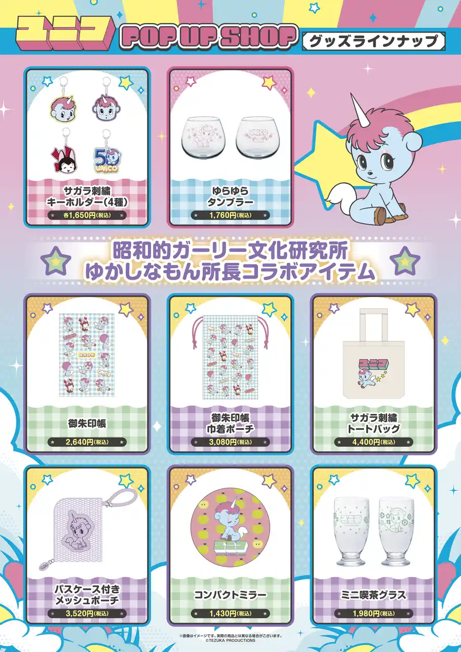 各会場では、ユニコ50thロゴやレトロ感のあるオリジナルグッズを多数発売。さらに、昭和文化を発信するインフルエンサー「昭和的ガーリー文化研究所」ゆかしな所長とのコラボレーション商品も登場します! |