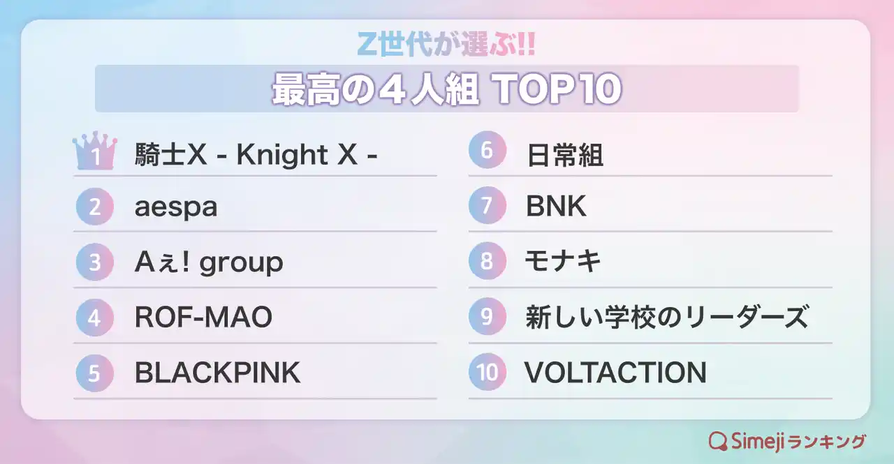 今回のランキングでは、「あなたにとって最高の4人組は?」というテーマのもと、アイドルやアーティスト、VTuber、配信グループなど、さまざまなジャンルで活躍する4人組がランクインしました。音楽やパフォーマンスを中心に活躍するグループだけでなく、動画配信やゲーム実況などオンライン発のユニットも多く選ばれており、Z世代らしい多様な“推し”の広がりが見える結果となりました。 |