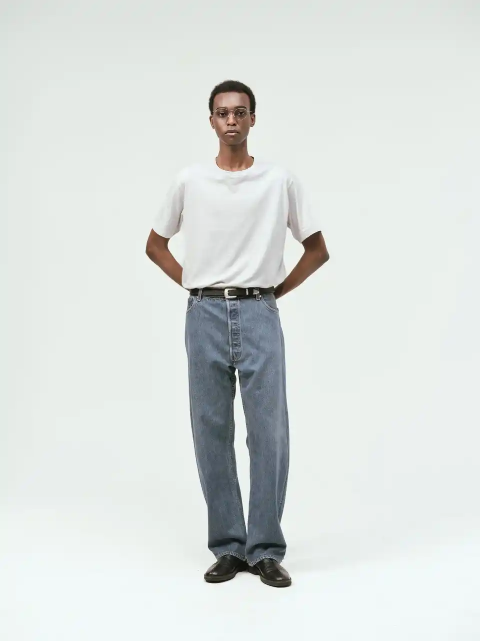 デニムにタックインしたとき、そのまま一枚で着たとき、どちらでも整って見えるバランスに仕上げています。 また、袖や裾にはヴィンテージ T シャツに見られるシングルステッチ仕様を採用。 |