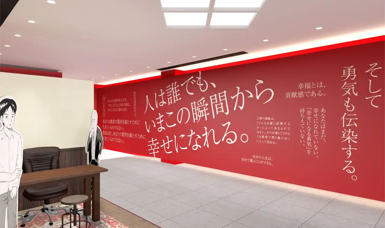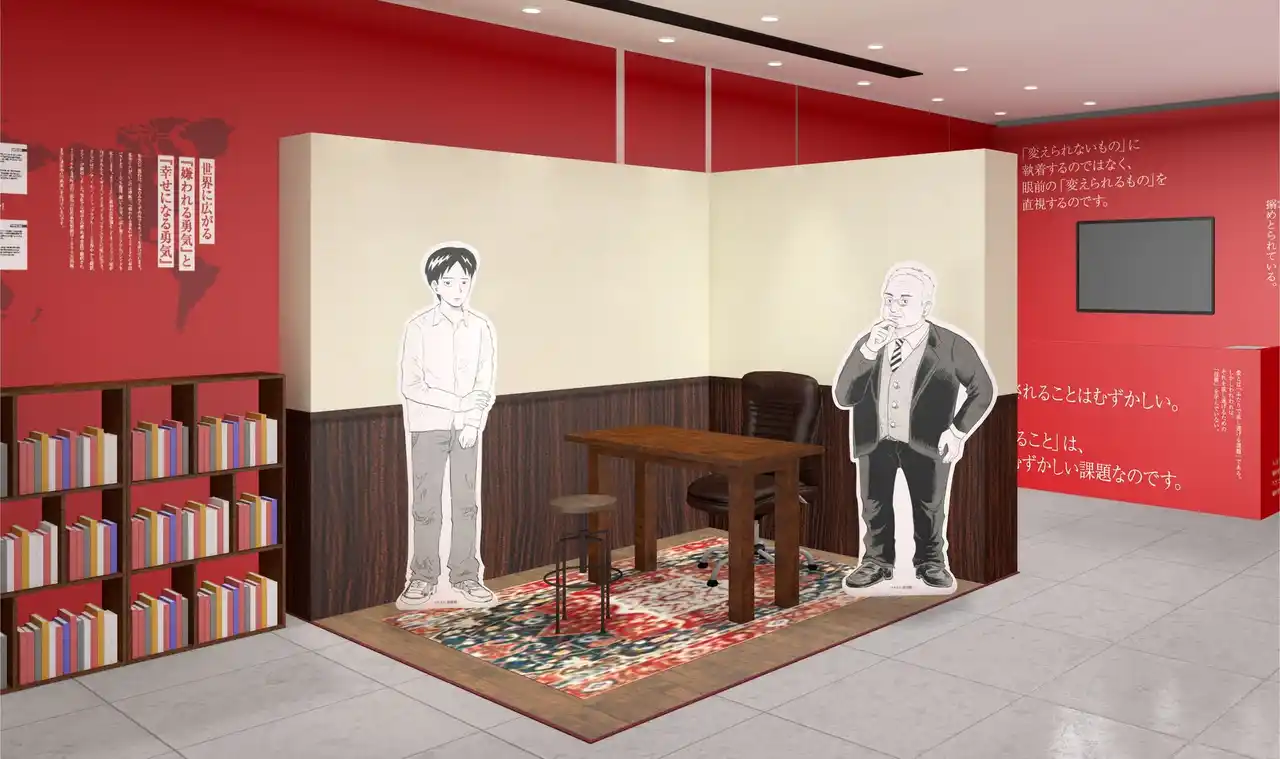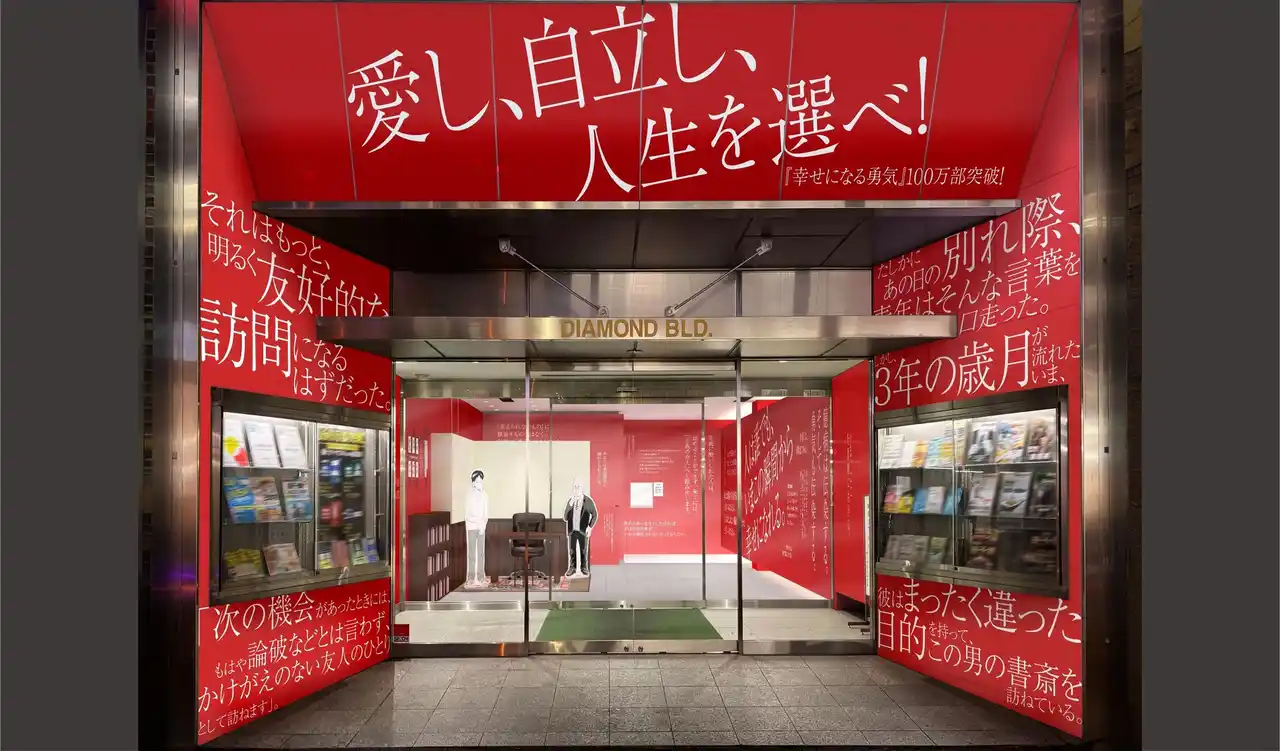 ダイヤモンド社として初となる、本社ビル1階でのミニポップアップイベントの開催が決定しました。会場では、『幸せになる勇気』の名言の数々を壁一面にデザインし、書影カラーである赤を基調に空間をラッピング。エントランスには、哲人の書斎をイメージしたフォトスポットを設置するほか、『嫌われる勇気』を含む各国翻訳本とともに、世界中から寄せられた読者の声も展示します。さらに、著者両名に悩み相談ができる「哲人へのお悩み相談ポスト」や、来場者が感想を書き込むことができる「推しコメントコーナー」など、参加型コンテンツも用意しました。開催期間中の平日は、どなたでも無料で入場いただけます。『幸せになる勇気』の世界観を体験できるイベントとして、ぜひご来場ください。 |