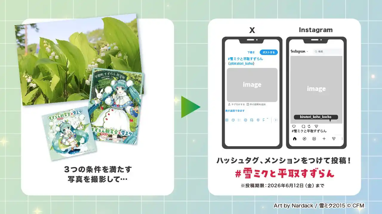 3.撮影した写真を、平取町公式アカウント(X:@biratori_koho / Instagram:@biratori_koho_kocho)へのメンションを含めた上で、ハッシュタグ「#雪ミクと平取すずらん」を付けて投稿すれば、キャンペーン参加完了! |