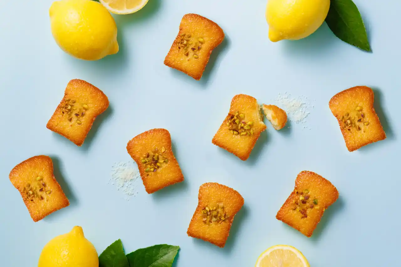 ゲランドの塩を使用することで、甘さの中にほんのりとした塩味が広がり、味わいに深みがあるフィナンシェです。さらに、レモン果汁・レモンペースト・レモンの糖漬け果皮を使用しているので、爽やかな味わいが口の中に広がります。トッピングには、ピスタチオを加えることで食感も楽しめる、見た目にも可愛いパン型フィナンシェに仕上げました。 |