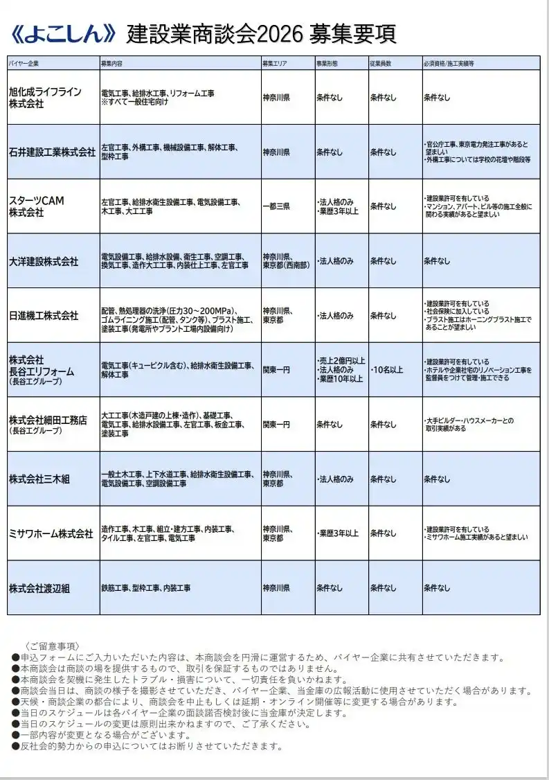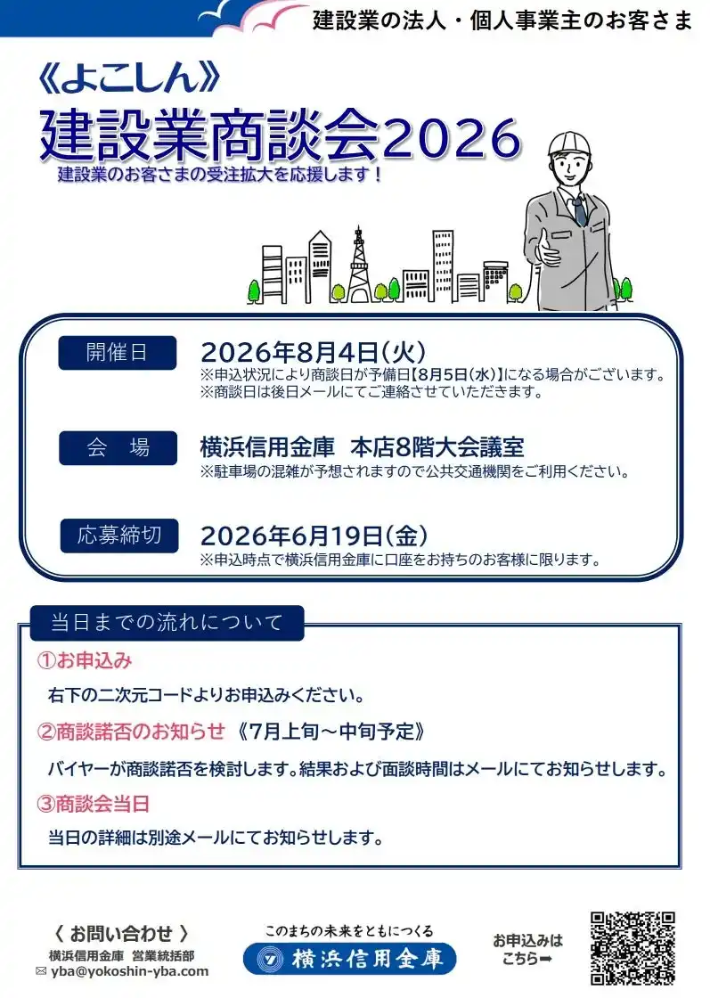 横浜信用金庫(横浜市中区 理事長 春日 隆)は、地域のお客さまの受注拡大を支援するため、2026年8月4日に「建設業商談会2026」を開催いたします。 |