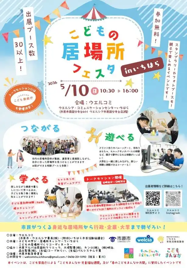 ウエルシア薬局は、2023年より毎年春頃に、千葉県市原市の子ども、若者の居場所について発信することを目的として、同市にあるウエルシア市原国分寺台店の2階のウエルシア・コミュニケーションセンターいちはら(ウエルコミ)において、市原市、NPO法人いちはら市民活動協議会、子どもの学び・居場所ネットワークいちはらと協働で「こどもの居場所フェスタ」を開催してきました。今年度はお取引先企業とともに、こどもの居場所づくりコーディネーターや大学も新たに加わり、より幅広い協働・協力体制で開催します。また、トークセッションにおいては、こども家庭庁のご担当者が登壇し、「こども・若者の居場所づくり」に関する国の最新動向と地域への期待についてお話しいただきます。 |