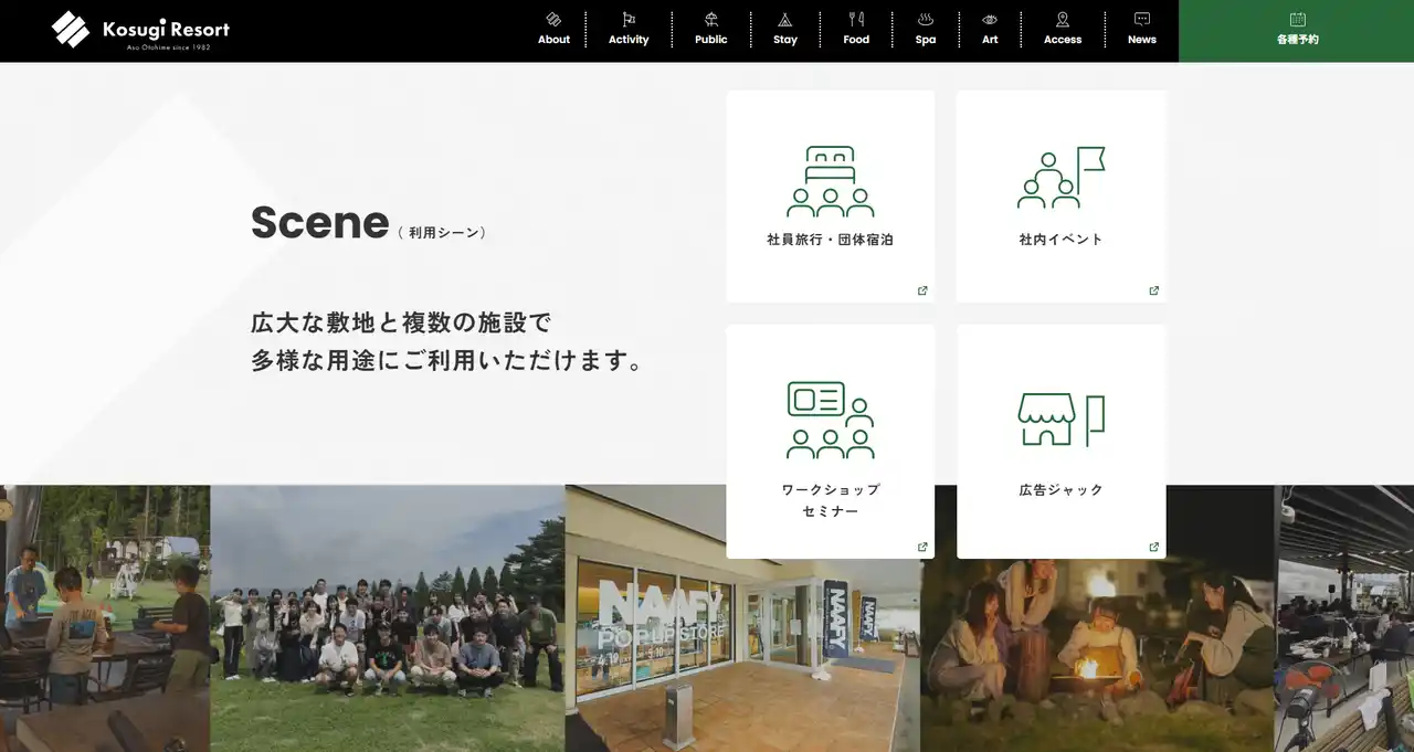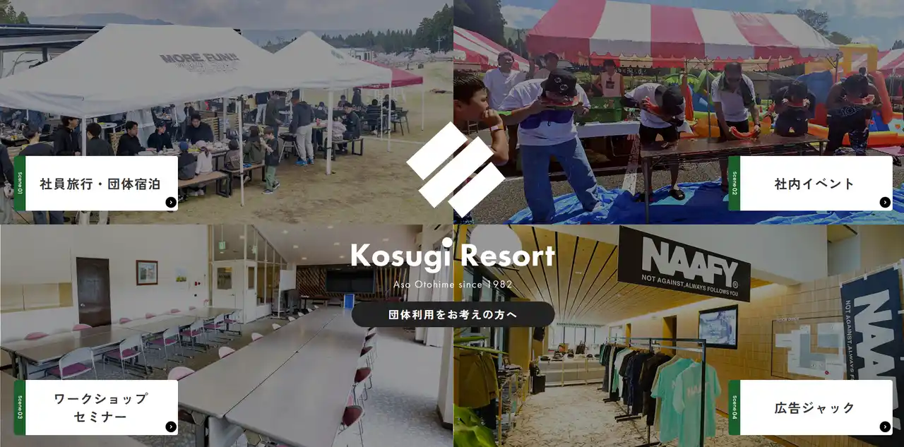 コスギ不動産ホールディングスグループ(熊本県熊本市中央区九品寺 代表取締役社長:小杉周司 以下「当社」 )の複合リゾート施設:コスギリゾート(熊本県阿蘇市)において、法人・団体利用向けLPサイトを新たに公開いたしました。 |