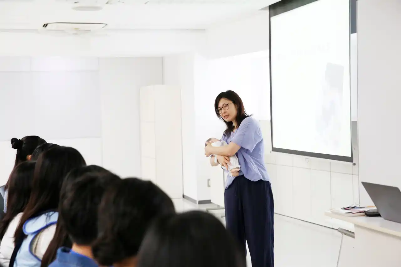 授業の前半では、神保先生から妊娠中の体調や生活の変化について、専門的な知見から詳しくお話しいただきました。 つわりの辛さ、お腹が大きくなることでの体の負担、そして精神的な浮き沈み。これらを学ぶことを通して、ただ「妊婦さん」と一括りにするのではなく、一人ひとり異なる状況にいるお客様にどうすれば安心していただけるかを、学生たちは真剣に考え始めました。 |