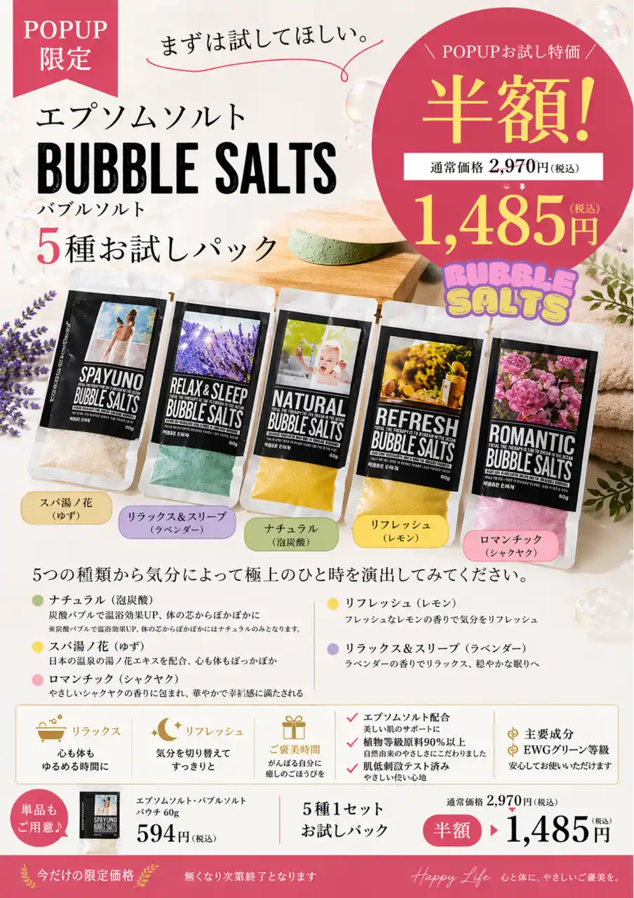 さらに、イベント期間中は、5種類の入浴剤をお試しパックとして数量限定販売! |