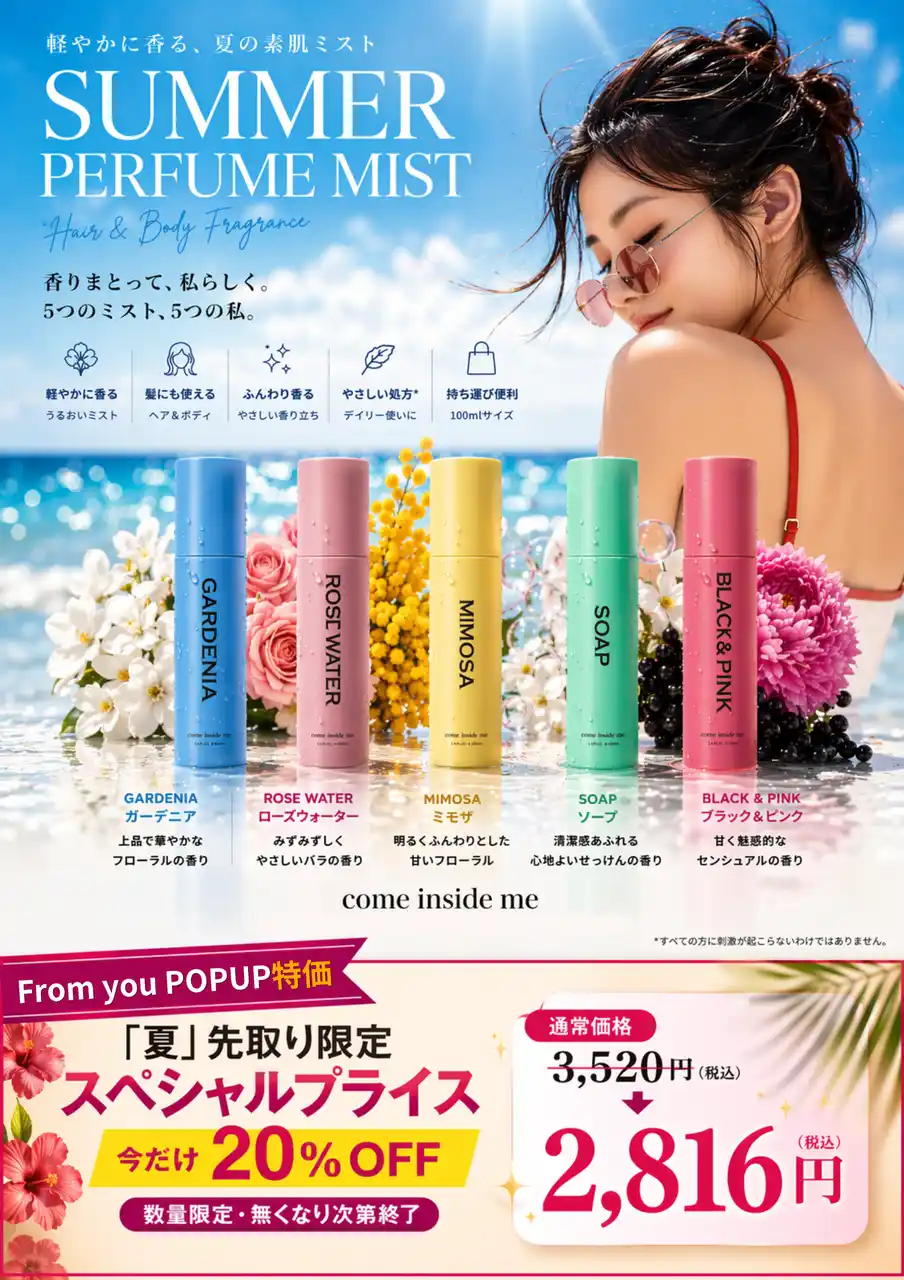 髪にも使えて動くたび自然に香り、外出先での香り直しにも最適。 |