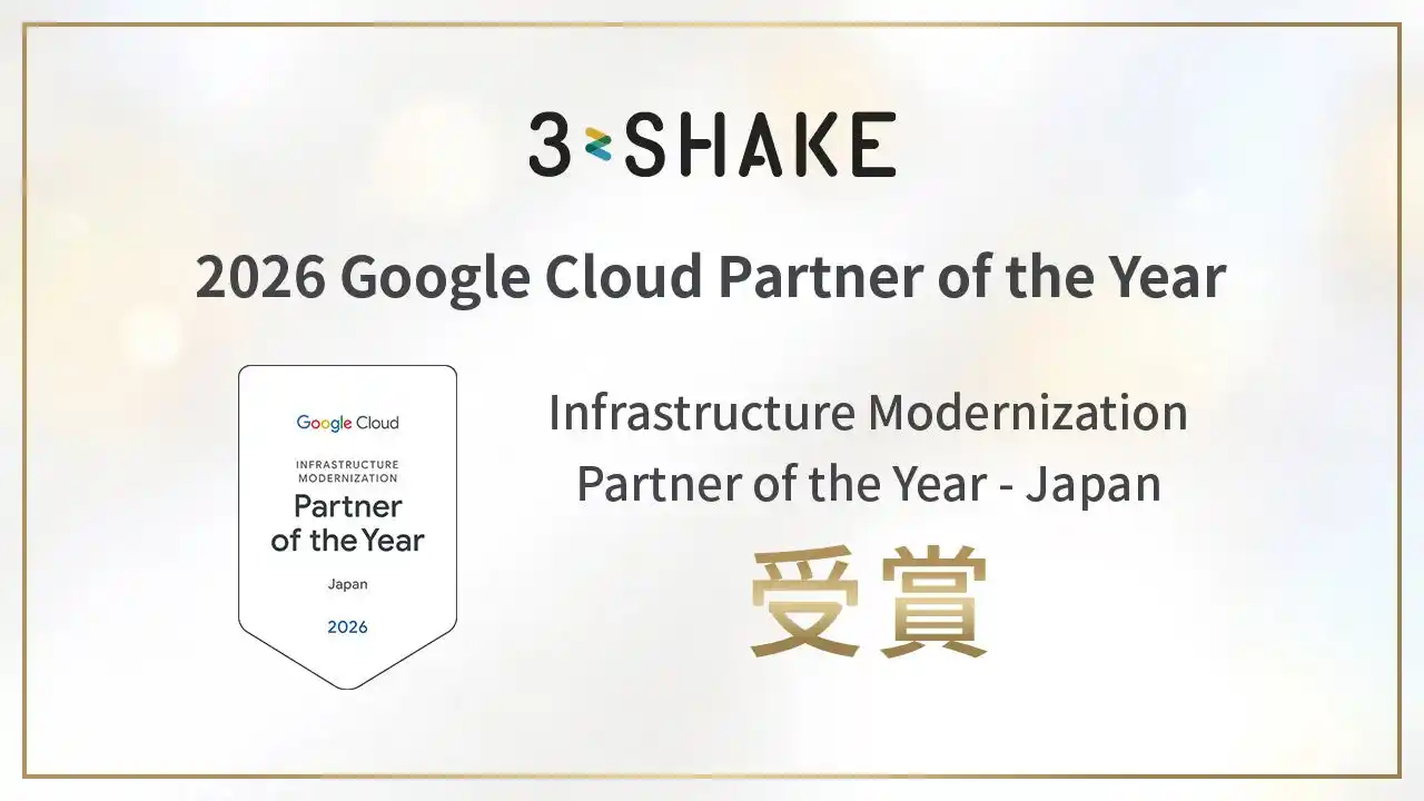 | 株式会社スリーシェイク(本社:東京都中央区、代表取締役社長:吉田 拓真、以下スリーシェイク)は、2026年4月21日に、「2026 Google Cloud Partner of the Year」において「Infrastructure Modernization Partner of the Year - Japan」を受賞したことをお知らせします。 | |||