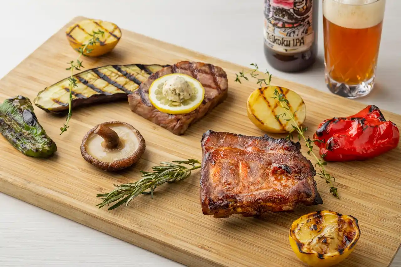 夏の香りとスパイス、そしてクラフトビールの個性が一皿ごとに重なり合う、シェアプレートディナーをご用意いたしました。天城の清流が育てた紅姫あまごを用いたアミューズ。前菜にはイズシカソーセージと夏野菜を香ばしく仕上げた彩り豊かなアヒージョを、スープは魚介と美味鳥の旨みが溶け合う風味豊かなブイヤベースなど土地の恵みを軸にした多彩な味わいが楽しめるラインナップです。メインには、国産牛サーロインとBBQバックリブのグリルにビールステーキバターを合わせた一品をテーブルにお持ちします。 |