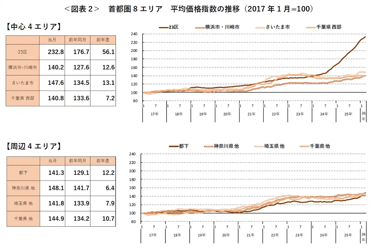 東京都(23区/都下)、神奈川県(横浜市・川崎市/他)の4エリアは2017年1月以降最高額を更新。東京23区では最高額更新が20カ月連続に。
