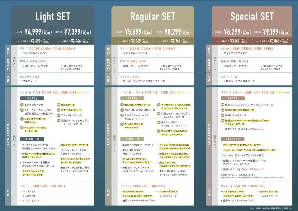4名様以上のグループでのご来店の際には、「ライト(2名様)」+「レギュラー(2名様)」など、異なるセットを組み合わせてご注文いただくことで、さらに多彩なメニューをシェアしてお楽しみいただけます。 |
