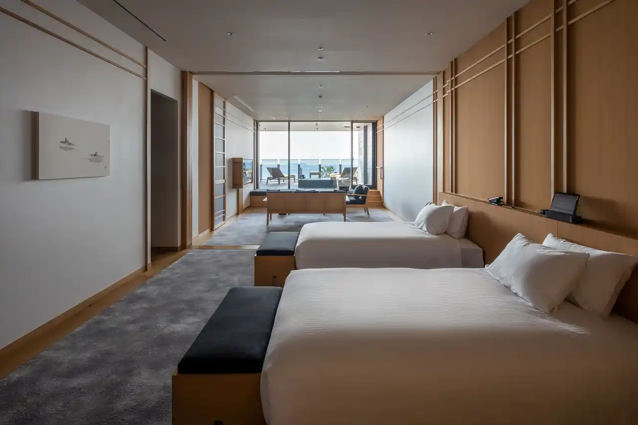 熱海サンビーチ正面に位置するラグジュアリーリゾートホテル。自家源泉を使った全長12mのインフィニティ温泉では、目の前の空と海と一体化する至福のひとときを過ごせます。館内にある「庵SPA 熱海」では、熱海特産のだいだいの精油を使用したアロマボディトリートメントや、オリジナルコスメを使用したフェイシャルで極上のリラクゼーションを。フィットネス施設「フィットネス ルキナ熱海」でのグループ貸切ヨガセッションや、隔週土曜開催のモーニングヨガもおすすめ。ワーケーションには、セミナーや展示会にも利用できるドローイングルームやミーティングルームを使用できるパッケージプランも。目的に合わせた多様な過ごし方ができる宿泊施設です。 |