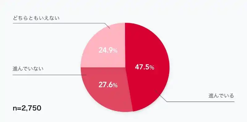 非IT部門における生成AI導入については、「進んでいる」と回答した人が47.5%ともっとも多い一方で、半数が「進んでいない」「どちらともいえない」と答えており、生成AI活用に課題を感じる人が多いことが伺えます。 |