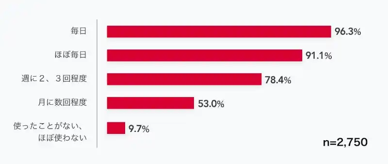 生成AIの活用頻度別に、生産性向上を実感しているかについて尋ねたところ、「毎日」「ほぼ毎日」使用している人の9割以上が生産性向上を実感していると回答しました。 |