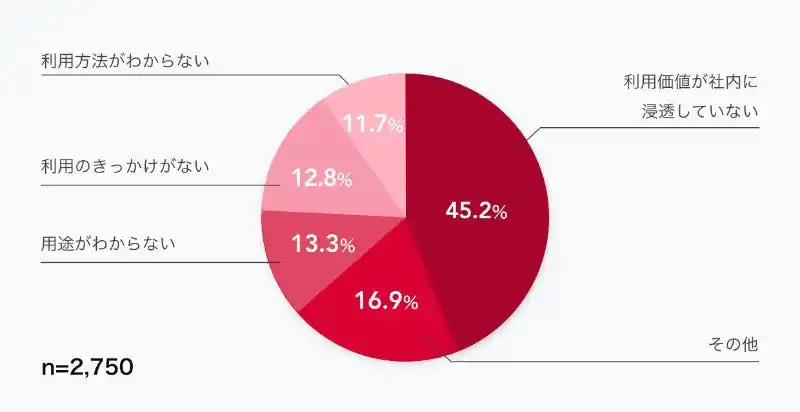 企業全体における生成AI導入の課題としてもっとも多くあげられたのは、「利用価値が社内に浸透していない」で、45.2%を占めました。次いで、「用途がわからない」「利用のきっかけがない」「利用方法がわからない」といった回答が続き、生成AIの活用方法やその価値が明確でないことに起因する課題が大半を占めていることがわかります。 |