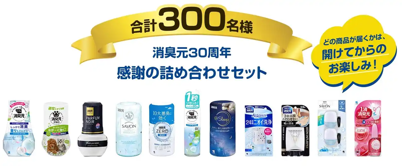 1995年の誕生以来、家庭の「ニオイの元」に向き合い続けてきた『消臭元』は、本周年を機に現代人が抱える「心のストレスの元」にも着目しました。30年分の感謝を込めて、プロのハウスクリーニングやエステ体験といった“リセット体験”などを300名に、さらにWチャンス賞として「消臭元30周年 感謝の詰め合わせセット」を300名にプレゼントし、住まいも心も双方が清々しく整う毎日を応援します 。 |