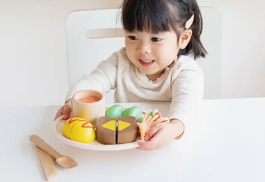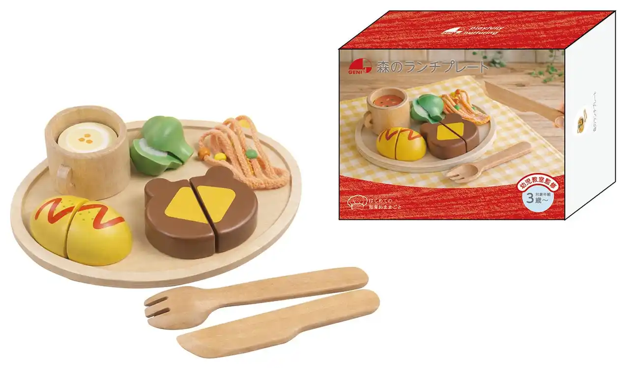 | 『森のランチプレート』は、こどもたちの「やってみたい」をそのまま形にした、木製のままごとセットです。プレートいっぱいに並んだお子様ランチは、見た瞬間に「これがやりたかった!」と感じるようなワクワク感を引き出します。テーブルに並べて「いらっしゃいませ!」とお店屋さんになりきったり、「どれから食べますか?」とやりとりをしたり。遊び始めたその瞬間から、こども自身が“役割”を持ち、ストーリーをつくり始めます。 | |||||||||||||||