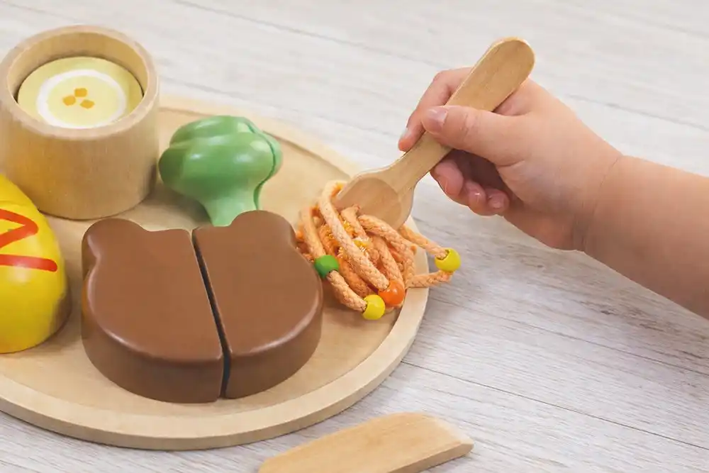 | ナイフで食材を切るときの手ごたえ、フォークでスパゲッティを巻く動き、カップを持って飲むしぐさなど、日常の食事で見ている動作を、自分の手で再現できることが、こどもにとって大きな満足感と達成感につながります。さらに、「今日はクマさんハンバーグにする?」「スープはどっちにする?」といった“選ぶ楽しさ”があることで、あそびが単調にならず、何度でも繰り返したくなる仕掛けになっています。 | |||||||||||||||