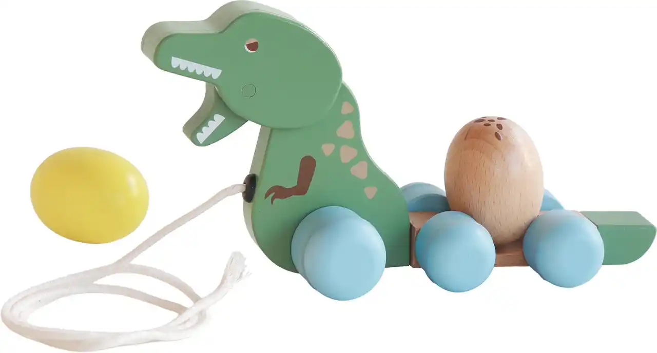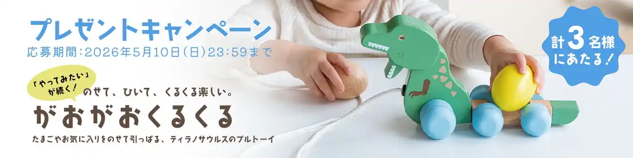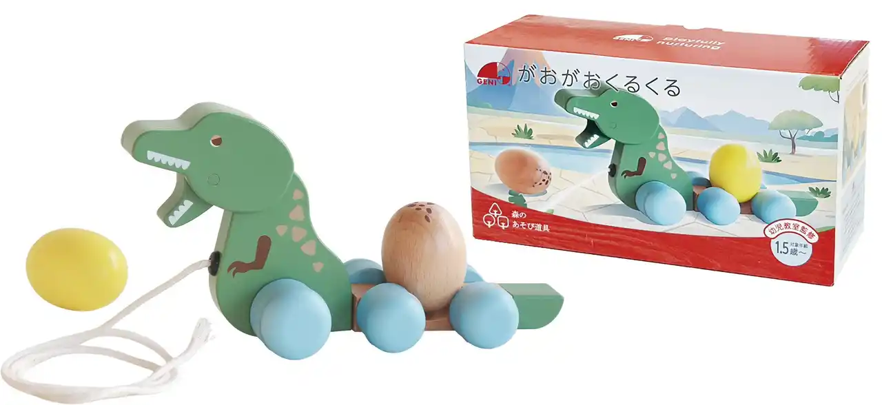 | 『がおがおくるくる』は、こどもに人気の恐竜・ティラノサウルスをモチーフにした木製のプルトーイです。引っ張ると、背中にのせたたまごがくるくると回りながらついてくる…その不思議な動きが、こどもの視線と興味を引きつけます。 | |||||||||||||||