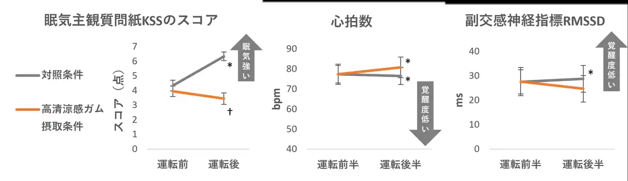 | 高清涼感ガム摂取条件では、運転による眠気質問紙KSSのスコア上昇が抑えられました。また自律神経指標においても、ガム摂取条件では咀嚼開始後に心拍数が上昇する一方で、副交感神経指標が維持されており、高清涼感ガムの咀嚼によって覚醒状態が保たれた可能性が示唆されました。 | ||||||||