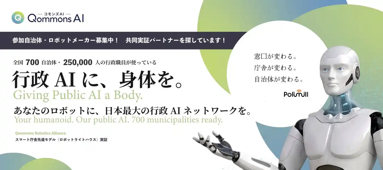 Polimill株式会社が開発・提供・運用する行政向け生成AI「QommonsAI」は、国内外の法律・政策・論文・自治体事例など数千万件以上のデータを基に、エビデンスベースで自治体課題の解決を支援します。 |
