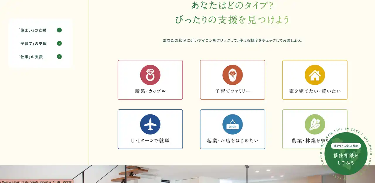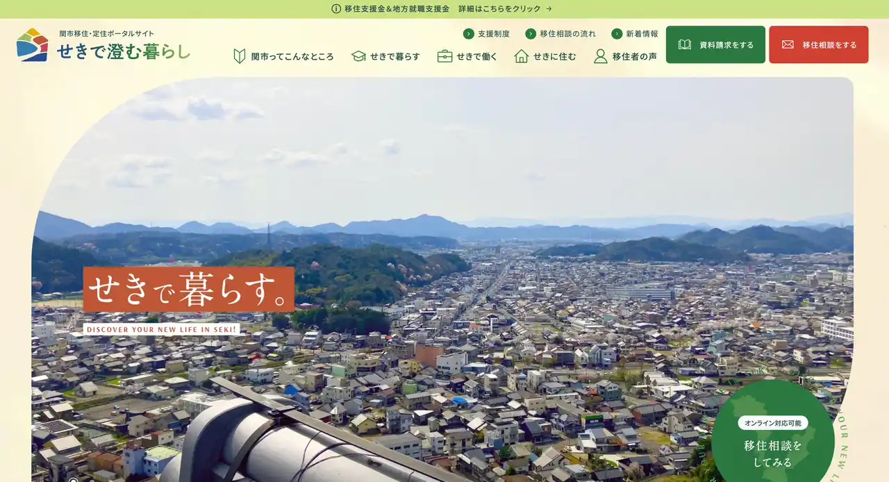岐阜県関市は、刃物の産地として世界的に知られる一方、豊かな清流や山々に囲まれた自然環境、円空仏や鵜飼などの歴史文化が息づくまちです。市は都市の利便性と地方の暮らしやすさを両立する環境を強みとしており、関市移住・定住ポータルサイトを通じて移住希望者への情報発信を行ってきました。今回、提案公募型プロポーザル審査によりサイト制作担当者として選定された当社が、ビジュアルデザインや情報構成を刷新。関市の魅力をもっと具体的に伝えるとともに、移住相談への導線を強化しました。 |