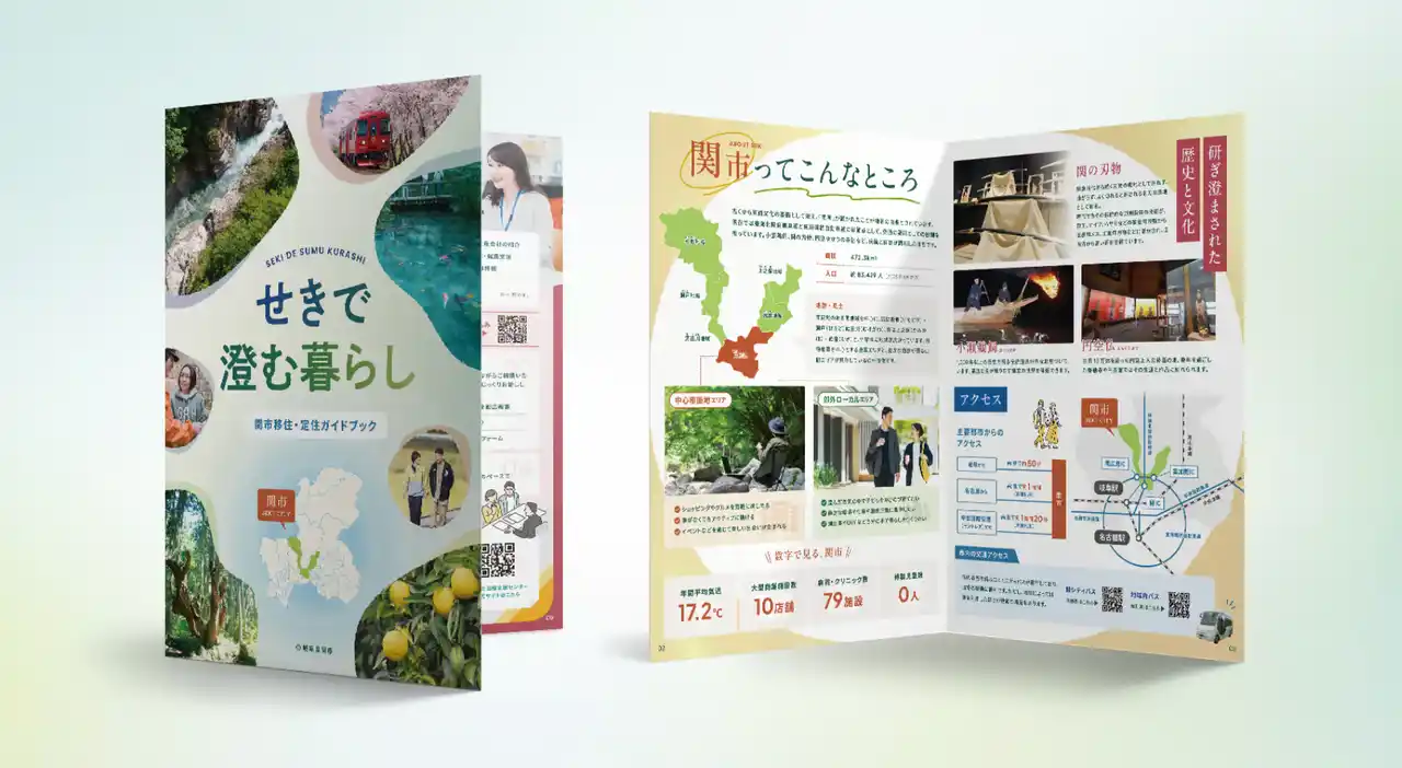 イベントや相談窓口などで配布するパンフレットも同時に制作しました。表紙には Webサイトと統一したビジュアルを採用し、中面では「関市ってこんなところ」「せきで暮らす」「せきで住む」「せきで働く」といった章構成で情報をコンパクトにまとめています。雑誌やライフスタイル系メディアを意識したレイアウトと、過度に堅くならない文章トーンにより、30 代の子育て世代でも心地よく読めるデザインに仕上げました。 |
