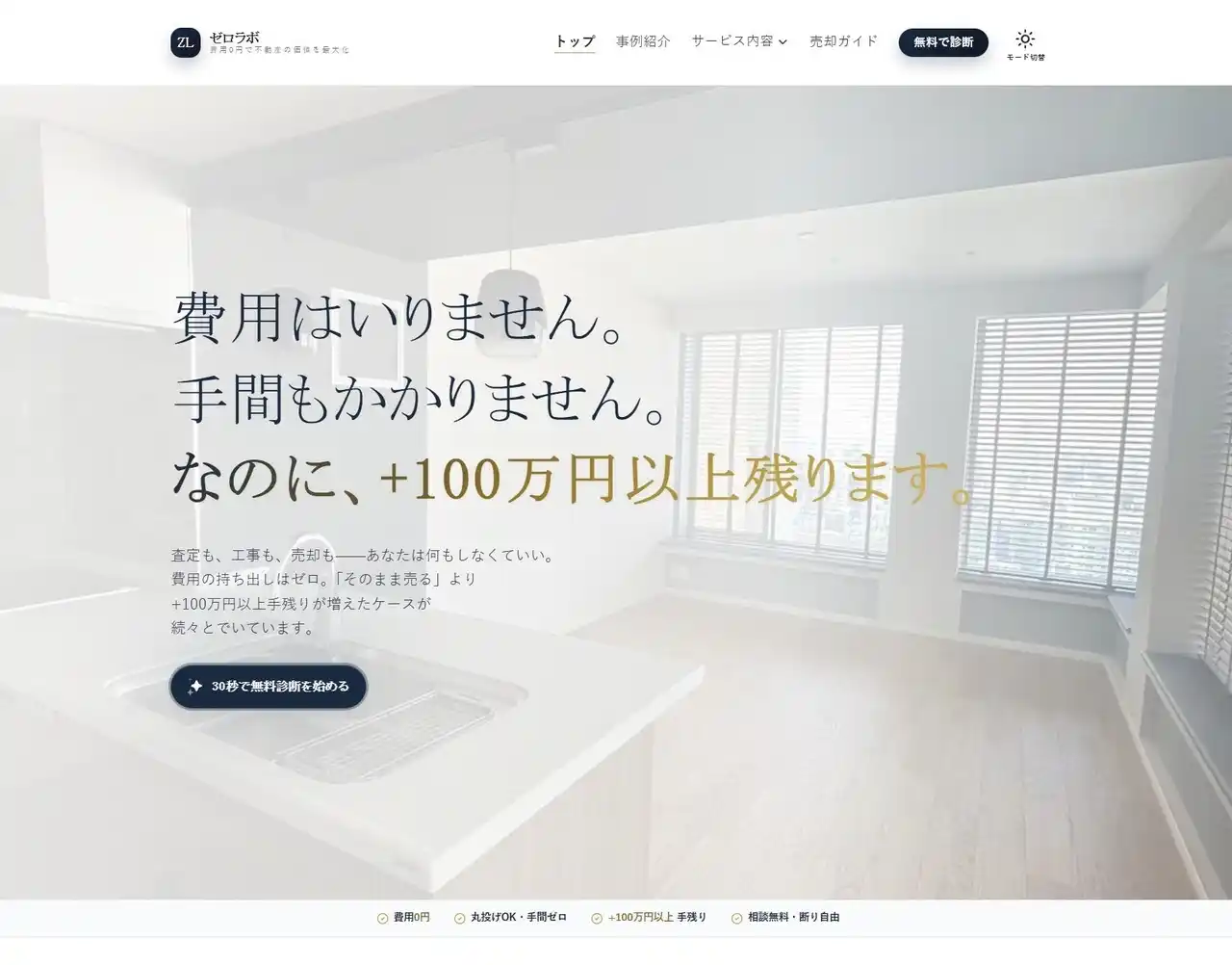 不動産売却を検討する売主様にとって、最も大きな不安は「自分の物件が本当に価値を再生できるのか、そして最終的にいくら手元に残るのか」という点に集約されます。しかし、従来の不動産業界ではリノベーションの内訳や利益構造はブラックボックス化されているのが常でした。 『ゼロラボ』の公式サイトでは、こうした不透明さを一切排除し、一件ごとの事例において物件が抱えていた背景や課題、それに対する戦略的なリノベーションプラン、さらには最終的な収支までをすべてつまびらかに公開しています。「ここなら嘘がなく、安心して任せられる」と確信を持っていただけるよう、今後も一つひとつの事例に込められた戦略と実績を詳細に発信し、納得感のある資産再生を支援してまいります。 |