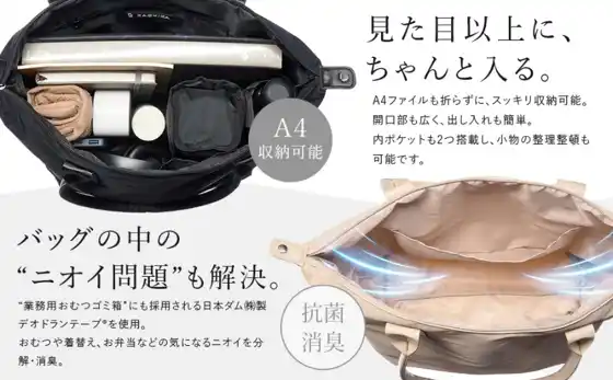 片側だけ肩から落ちるストレスを防ぐハンドルまとめストラップ、急な雨でも気にしない撥水素材、汗をかいた衣類も気兼ねなく入れられる日本製デオドラントテープ。A4ファイルを折らずに収納できる余裕のある設計と、小物が迷子にならない整理しやすいポケット構成。使い込むほど、設計の丁寧さが伝わってくるバッグです。 |