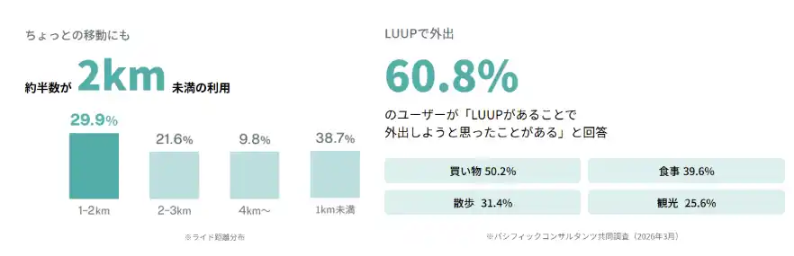 サービス提供開始から6周年を記念し、特設サイトを公開します。本サイトでは、LUUPが日常の交通手段として定着していることを示すデータを紹介しています。「2km未満のライドが約半数」「外出のきっかけになったユーザーが60.8%」に上るというデータから、その実態をご覧いただけます。 |