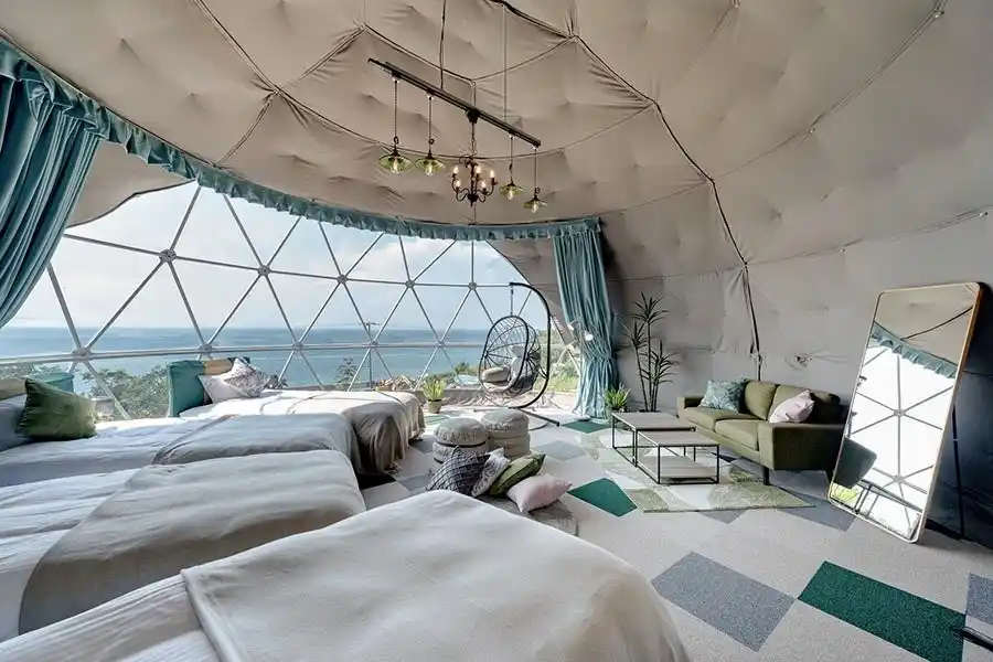 大阪市内から車で約90分。淡路島西海岸に位置する、わずか4棟限定のプライベートグランピング。広々としたドームテントは快適にアウトドア感を楽しめ、ファミリー旅行からカップルでの滞在まで、周囲を気にせず贅沢なひとときを過ごせると好評です。瀬戸内海の夕日を望む絶好のロケーションとともに、日常を忘れる非日常体験をお楽しみください。 |
