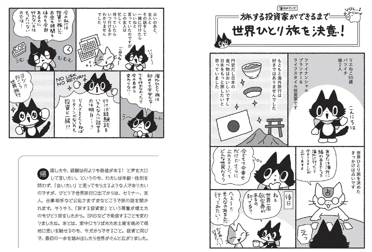 本書では、誰でも簡単にまねできる再現性の高い投資術はもちろん、「投資で世界一周ひとり旅の夢を叶えた方法」も実体験を交えたコミックエッセイで収録。お金を稼いで「自由」や「好き」を手に入れるコツがつかめる内容になっています。 |