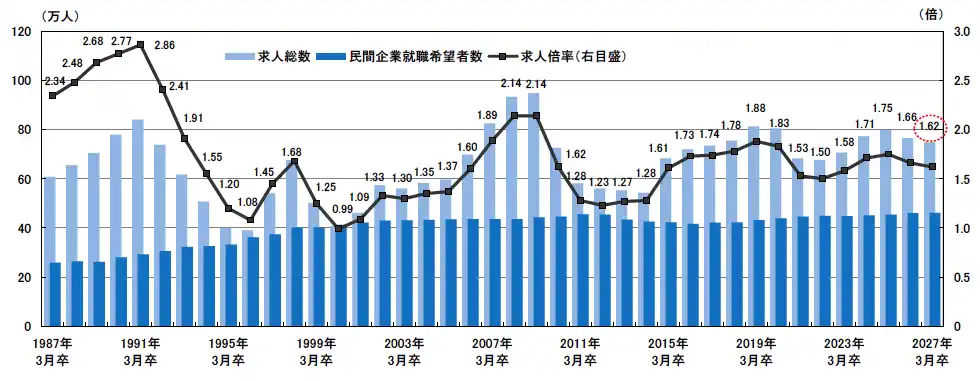 2027年3月卒業予定の大学生・大学院生対象の大卒求人倍率は1.62倍と、2026年卒の1.66倍より0.04ポイント低下した。 |