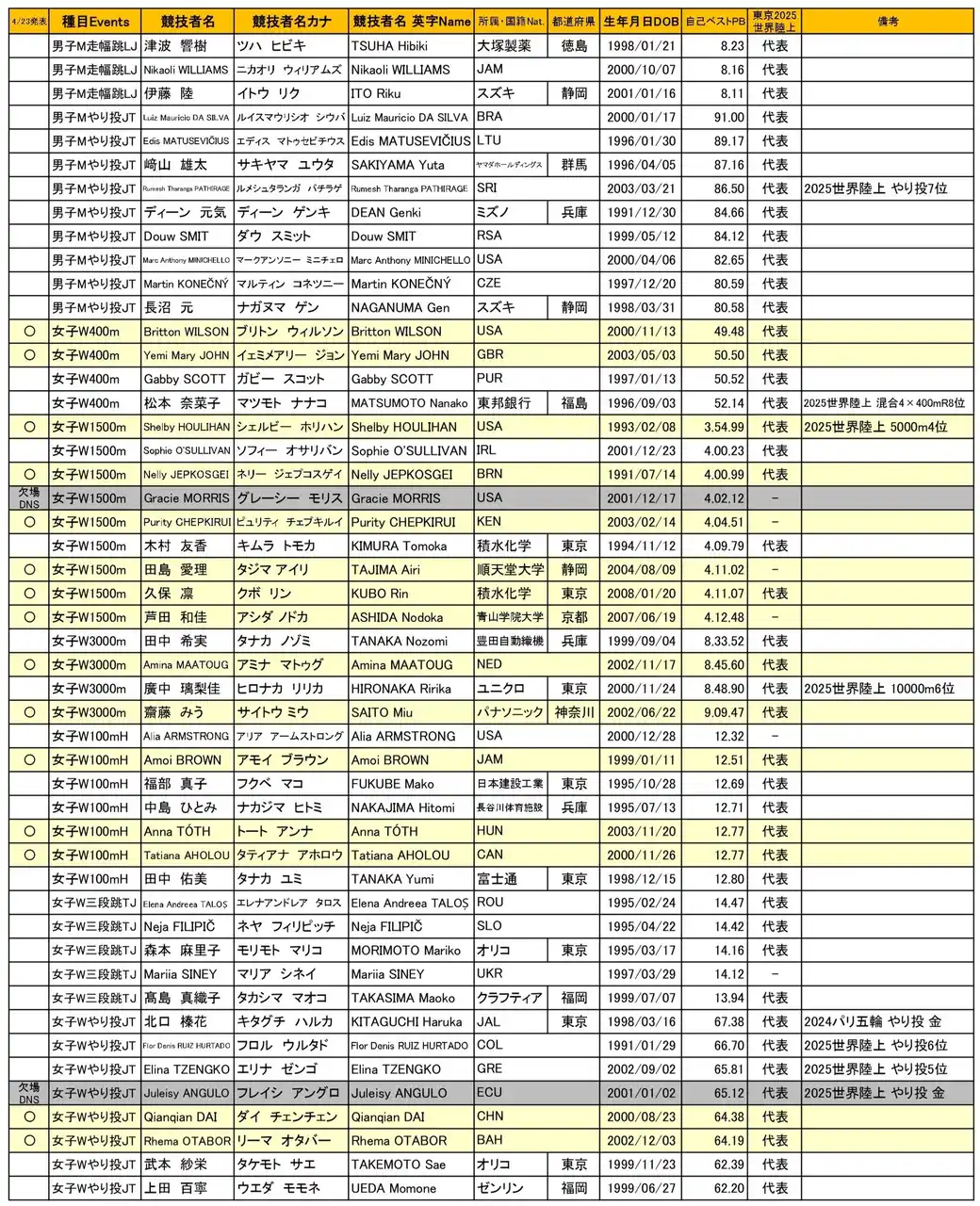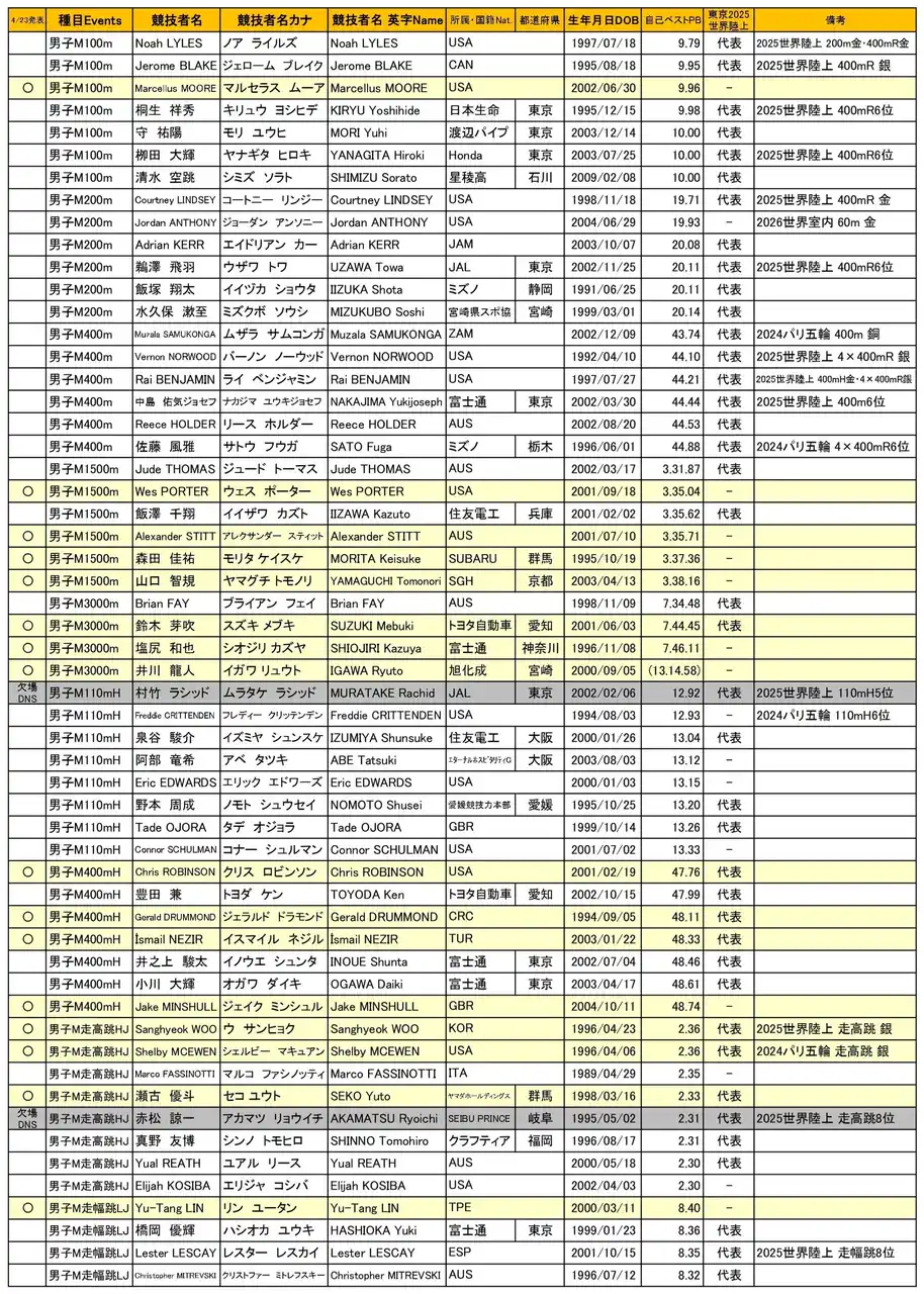 | ■セイコーGGP エントリーリスト ※4月23日現在 | |||