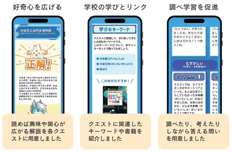 クエストを解けたら終わりではなく、そこから子どもの好奇心をさらに広げたり、学校での学びとリンクさせたりするような仕掛けを学習参考書の出版社ならではのアプローチで用意しました。 |